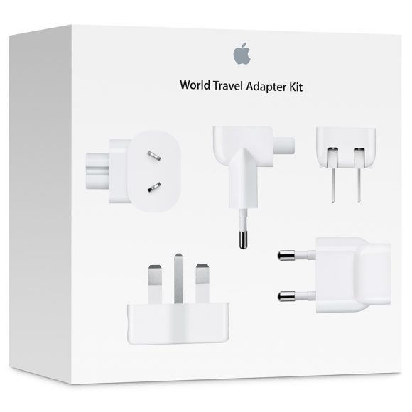 World Travel Adapter Kit includes a set of seven AC plugs with pins that fit different power points around the world, each laser-etched with the regions they are compatible with.